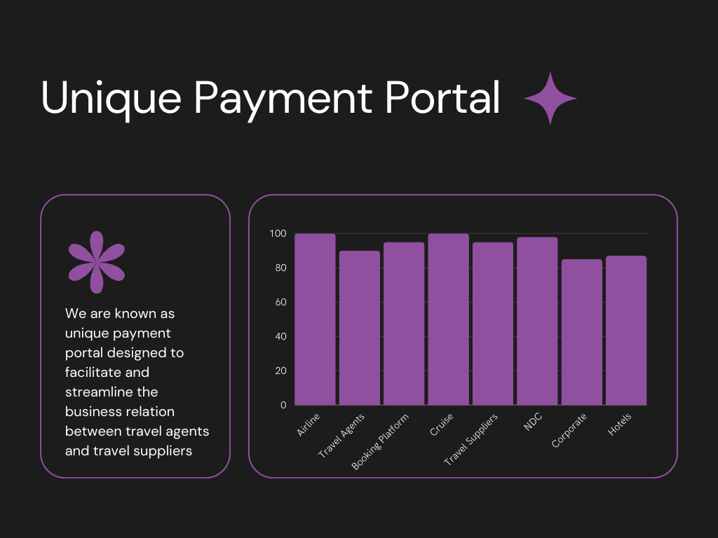We are known as unique payment portal designed to facilitate and streamline the business relation between travel agents and travel suppliers like airlines, hotels, cruises, rail, etc..